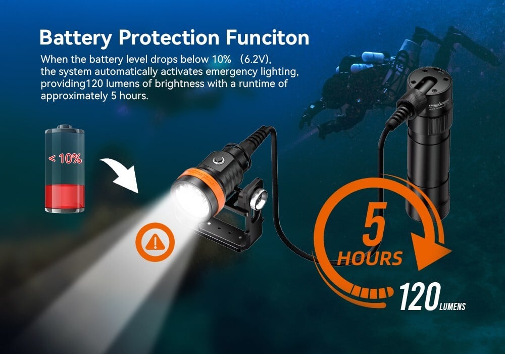 OrcaTorch D630 v2.0 — надежный канистровый фонарь для технического и пещерного дайвинга. Более 4 часов при 4600 люменах, а при снижении заряда ниже 10% (6.2В) автоматически переключается в аварийный режим на 120 люмен с дополнительными 5 часами работы — важный запас по безопасности, который оценят ваши клиенты.